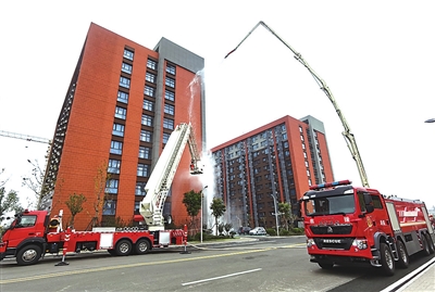 当天上午的启动仪式上设置了队伍形象、灭火装备、通讯装备等展示区域,现场还展示了车辆装备器材和实战化业务操法。随后,一场紧张有序的校园灭火救援实战联合演习拉开帷幕。莱西市消防救援大队的消防车赶到现场后,登高平台消防车迅速升起数十米高的长臂,靠近“起火”的建筑物顶层,营救楼顶的被困人员。随后,随着高喷消防车的引擎发动,车顶的高喷水炮展开,对准“起火”建筑物喷水,从高处扑救。这场演练从接警调度、火情侦察、预先展开、阵地设置、人员搜索、破拆排烟、阵地转移等方面进行了实战演习,有效提升了消防队伍和校园的联合作战水平。
