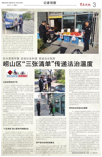 近日,崂山区发布《轻微违法行为不予行政处罚和一般违法行为减轻行政处罚事项清单(2023)》,涉及22个执法监督领域共451项行政处罚事项,包括不予处罚事项428项,减轻处罚事项23项,动态更新了首违不罚、轻微违法不罚和一般违法行为减轻处罚的“三张清单”。其中,涉及崂山区综合行政执法局114项。在法治中国建设不断推向深入的大背景下,不罚、轻罚清单作为一项探索创新,能为综合执法和法治政府建设带来怎样的影响?晚报记者走进崂山区综合执法一线,一探究竟。