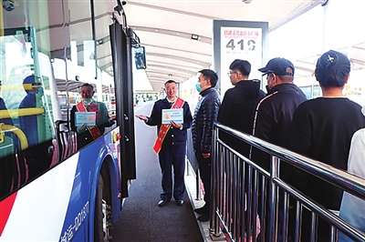 在铁路青岛北站东广场公交站,记者看到志愿者身披授带,手持写有“请大家排队上车,注意安全”“车要进站,请您靠边走”等内容的文明乘车指示牌,引导市民乘客排队乘车,文明礼让,维护上下车秩序,照顾老弱病残孕等特殊乘客,热情为外地旅客解答线路换乘问题。在公交志愿者的引导下,公交站内乘客们相互礼让、依次上车,以实际行动展现出了岛城市民的文明风采。