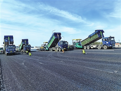 本报11月13日讯 摊铺机、压路机、运输车、穿梭轰鸣,进行沥青桥面的摊铺、碾压,施工技术人员手持检测设备不间断地对新铺设的沥青桥面进行检测……近日,在国道204大沽河特大桥施工现场,第二层沥青面铺设接近尾声,即将开始路面附属设施施工。