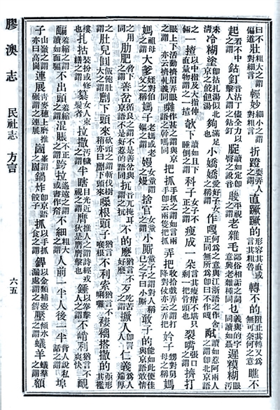李惠玲整理的部分词汇在1928年出版的《胶澳志》中可以查到,比如“欹下:读‘且下’,睡倒之谓”,“妗子:甥对舅母之称”,“折蹬:耍弄人之谓”等。“这些方言核心词汇,常用的目前仍广泛使用。”中国海洋大学副教授刘一梦表示,随着历史的变迁,一部分方言核心词会流传下来,一部分不常用的会消失。部分方言以地方戏曲这种文化形式保存下来,因为戏曲滋润的土壤就是方言和地域文化。柳腔《寻功夫》中有一段戏文:“土地庙里把钱数,三百个大钱少着仨,今天你还来骗我,骂声你这个臊蛤‘拉’。”此文中的“蛤拉”读成“gala”,正与如今“哈啤酒吃蛤蜊”同音同意。
