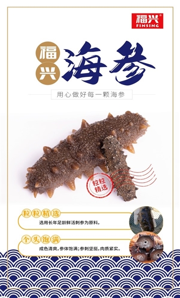 福兴海参在大连、青岛胶南海域采购长年足龄海参,从每一只活海参采收开始,到生产加工,经过严格的质量检验。福兴海参色泽为黑灰色或灰色,颜色自然;体形端正,个头均匀,结实而有光泽;刺尖挺直,切口小而清晰整齐,腹部下的参脚密集清晰;十多倍涨发率,泡发后肉质紧实饱满,口感Q弹有力,韧性足;水域清洁,内里无沙,内筋粗壮白皙。