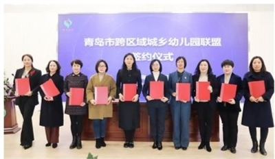 会上,青岛市学前教育跨区域城乡幼儿园联盟举行了签约仪式,15所城区幼儿园分别与15所强镇筑基试点镇的中心幼儿园结成联盟,围绕深化课程教学改革、推进优质资源共享、提升保育教育质量进行合作。