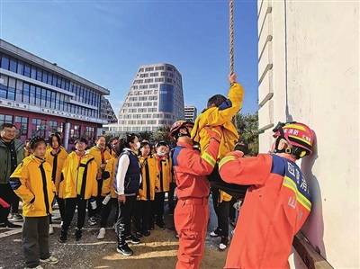 在消防体验馆内,消防救援人员让学生们亲身体验了索降逃生和烟雾逃生,学习消防安全常识。在消防救援人员的指导下,学生们通过VR系统,学习正确拨打119报警电话、快速找出火灾隐患等知识。在互动实操环节中,消防救援人员展示了穿戴战斗服、绳索攀爬、队列展示等项目。