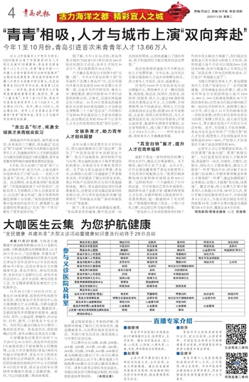 大型健康知识普及行动将于11月29日至30日举行,青岛市中医医院(市海慈医院)干部保健科主任魏陵博、山东大学齐鲁医院(青岛)神经内科副主任赵翠萍、青岛市市立医院东院营养科主任师顾萍、青岛市第六人民医院感染性疾病诊疗中心主任段建平4位医学专家,将从各自的专业领域带来健康科普线上直播讲座。届时,可以扫描直播二维码来观看。