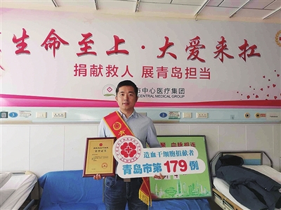 37岁的高发圣是一名自由职业者。2017年,他在参加无偿献血时了解到捐献造血干细胞能够挽救血液病患者的生命,便自愿报名加入中国造血干细胞捐献者资料库,成为了一名捐献志愿者。今年10月30日,高发圣接到李沧区红十字会电话,得知与一位血液病患者配型成功。他毫不犹豫地表示同意继续捐献。由于患者病情较为危急,为争分夺秒救助患者,高发圣于10月31日同步进行高分采样和捐前体检。在高分和体检结果完全符合捐献条件后,他于11月26日至11月30日期间,在青岛市中心医院完成了造血干细胞捐献。高发圣的妻子孟女士知道丈夫要捐献造血干细胞后,十分心疼他,但深知丈夫是在做好事,可以挽救晚期血液病患者的生命,于是坚定地支持丈夫的决定。孟女士告诉记者:“我觉得通过发圣捐献,有机会能救人一命,挽救一个即将破碎的家庭,也算是人生价值的体现。”高发圣也直言,捐献造血干细胞有一种特别神圣和骄傲的感觉,“人这一辈子,总得做些让自己骄傲、对社会有意义的事儿。这次捐献造血干细胞救人,我终生难忘。”