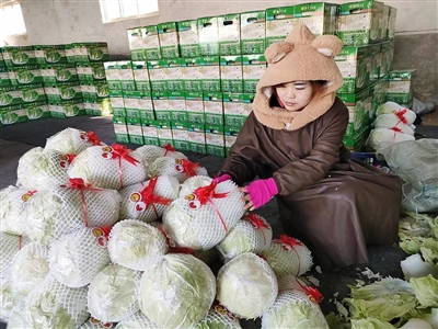 记者在青岛盛河蔬菜种植专业合作社看到,收获的胶州大白菜整齐地码放在院子内,掀开覆盖在白菜上面的篷布后,一棵棵白菜包裹结实,重约五六公斤。记者注意到,十多名工人剥去白菜的多余菜帮,套上塑料包装袋,接着系上红绳,贴上特制的地理标志标签和“胶白”防伪标签后,便装箱打包。