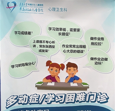 “孩子刚上小学,才学了半个学期,老师就建议我带孩子去看学习困难门诊,我的孩子有问题吗?”近日,陆续有小学一年级学生家长向记者反映,因为孩子上课和写作业注意力不集中或是有多动的表现,课堂小测验和其他同学相比有很大的差距,被老师建议“带孩子去医院看看”。市民刘丽(化名)在多次收到老师的建议后,终于决定带刚上一年级的儿子文文去青岛妇儿医院本部看学习困难门诊,但这个门诊的火爆程度超出了她的想象,“我是10月15日挂号的,预约排期等了一个月才看上。”学习困难门诊为何如此火爆?什么样的孩子需要看学习困难门诊?看了这个门诊就能逆袭吗?孩子学习遇到困难,家长可以做些什么?带着这些家长们最关心的问题,记者对学校、医院进行了实地探访。