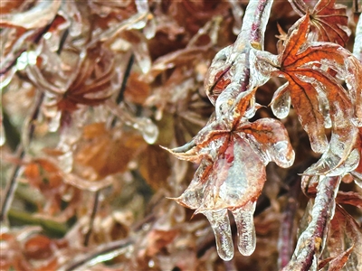 11日,崂山风景区出现雨凇和云海交融的梦幻景观。九水游览区的雨凇与红艳艳的枫叶融为一体,晶莹剔透。巨峰游览区云海缭绕,雨凇景观宛若仙境,充满诗情画意。