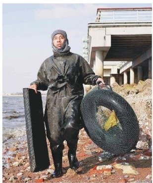 因为训练刻苦认真,夏润福被评为“优秀士兵”,还在2004年入党。2007年,夏润福退伍后当过汽修工,2014年来到青岛,和姐姐一起经营大桶水生意。“当时,心情不好就喜欢去海边转转,一看大海,啥烦心事都没了。”夏润福称,2016年,和妻子第一次去赶海时,两人捡到了不少螃蟹和海蛎子,满满的收获让他十分惊喜。从那时候开始,只要天气允许,他都会摸准潮汐规律,去胶州湾边赶海。夏润福赶海,一赶就是七年,他的装备也变得越来越齐全。塑料网兜、胶皮裤、泡沫板、轮胎内胆、头灯,成为了夏润福赶海时必备物品。