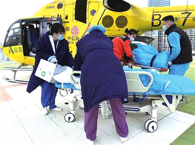 据了解,医疗救援直升机于15时4分降落到灵山岛临时起降点。经医务人员现场评估,15时15分,直升机载着患者立即飞往市立医院东院,仅用25分钟便将患者安全平稳送达医院。早已等候在停机坪上的医护人员快速与机上工作人员完成交接。