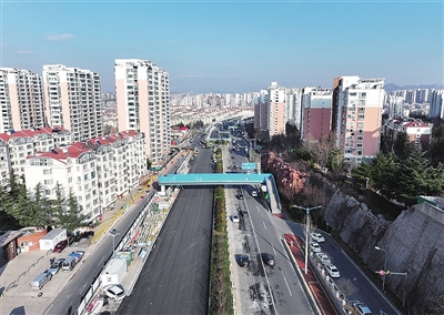12日,记者在项目现场看见,施工人员已完成了路面工程的沥青摊铺工作,从空中俯瞰,车辆来回穿梭异常“丝滑”。据了解,目前辽阳路快速路工程北半幅地道已完成面层沥青摊铺,施画好了道路标线,机电安装等工作也已完成,正在开展竣工验收工作。妇儿医院附近的路面,已经完成了绿化施工。