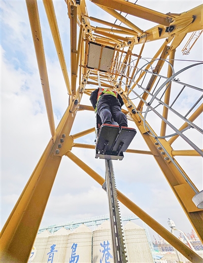 本报12月14日讯 随着高层建筑不断增多,塔吊也不断升高,传统徒手攀爬方式危险性较大,安全保障措施不足,遇到恶劣天气或人员突发身体状况时危险系数急剧增大,给施工安全带来更大隐患。日前,中铁建工青岛国际邮轮港区航运中心项目创新引入使用青岛首例塔吊爬塔机设备,破解施工安全风险的同时,开启了塔机机械攀爬的新时代。