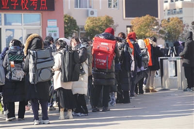 “稳着点,别紧张!”“一个月没见,我怎么感觉他长高了。”按照惯例,统考前,很多美术生会在画室参加为期数月的封闭集训,吃住都在画室;考试当天,部分考生从画室集体坐大巴车赶考。因此,一些考生家长已经很长时间没有见到孩子,他们守在考点外,就等着看一眼孩子,说几句鼓励的话。很多家长穿着厚羽绒服、贴着暖宝宝来送考,尽管冻得满脸通红、瑟瑟发抖,还是坚守在考点外,一站就是一个多小时。