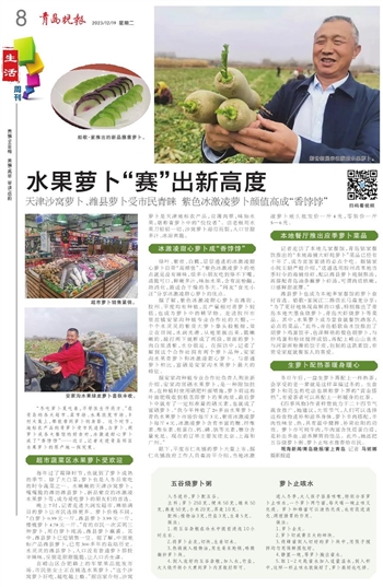 在崂山区合肥路上的车家果品批发市场,市民张女士正在挑选水果萝卜,“这个沙窝萝卜好吃,越吃越上瘾。”据店家介绍,沙窝萝卜是天津地标农产品,皮薄肉翠,味如水果,堪称青萝卜中的“佼佼者”。店老板用水果刀轻轻一切,沙窝萝卜迎刃而裂,入口甘甜多汁、冰凉爽脆。