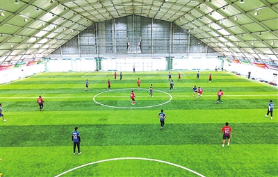 冬季的金沙滩啤酒城时光静好,城内的啤酒大篷变身室内体育运动大篷,满足大众休闲娱乐健身需求。目前开展的体育项目有足球、篮球、羽毛球、网球、轮滑等,在谈的潮流运动项目还有飞盘等。据介绍,足球大篷拥有两片7人制足球场地,深受足球爱好者的喜爱,档期到本月底已全部约满。