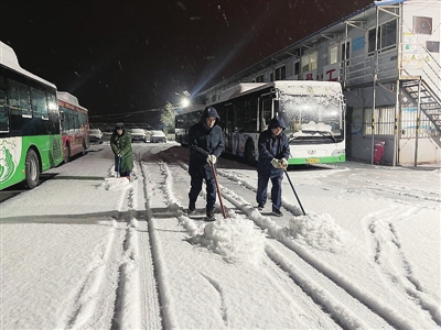 本报12月20日讯 一股强冷空气,给我市带来了今冬首场明显降雪。气象部门发布大风和道路结冰预警。我市公共交通等部门积极行动,紧急加入到扫雪除冰工作当中。