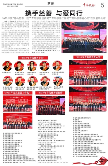 2023年,青岛这座有温度的城市,涌现出了许许多多的慈善典型、创新项目,收获了慈善硕果。经过组织评选,海尔集团公司等10家单位获得“2023年青岛慈善十佳”荣誉称号;黄岛区“幸福来敲门”关爱项目等11个项目获得“2023年青岛慈善创新奖”;青岛经济技术开发区慈善总会等17家单位(个人)获得“2023年青岛慈善工作奖”;青岛华商投资集团有限公司等21个团队(个人)获得“青岛慈善爱心奖”。