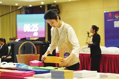 “斟酒时左手托盘,右手持瓶斟酒,酒标朝向客人,瓶口不碰杯口,斟倒时做到不滴不洒……”这是在席间服务项目中,服务人员要掌握的基本礼仪。杜雨霏介绍说,餐饮服务比赛项目包含仪表仪容展示、工作台准备、中餐宴会摆台、席间服务、专业理论与英语问答环节,要求选手在一定时间内高标准完成专业技能。
