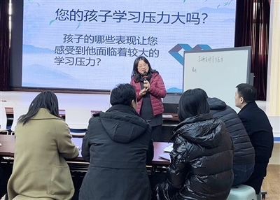 本届年会的重头戏之一就是展示课。一直以来,青岛实验初中加强家校社协同育人合力,推广青岛市家庭教育“五步教学法”,打造校园“家庭教育指导师”团队,帮助家长掌握科学家庭教育理念和方法。作为青岛市家庭教育名师工作室主持人、青岛市名师,青岛实验初中老师缴莉萍在家庭教育名师展示课环节,和家长们交流讨论了孩子学习压力大的一些具体表现,针对孩子压力的来源和缓解压力的方法两个问题展开研讨。以家长为主体,在思考讨论和分享交流中,找到缓解孩子学习压力的方法。通过一节课的讨论学习,家长们收获良多。