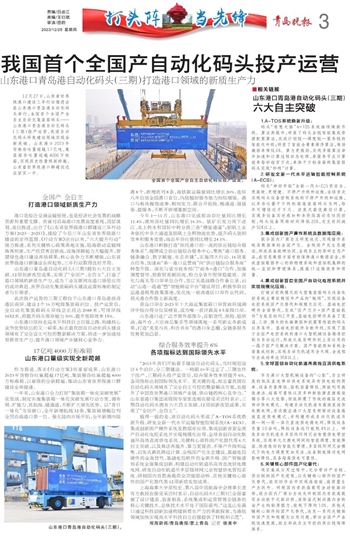 “2013年我们开始着手建设自动化码头,当时规划设计6个泊位,分三期建设。一转眼10年过去了,三期也终于投产,三期码头投产运营后,综合服务效率将提升6%,各项指标达到国际领先水平。更关键的是,标志着我国在自动化码头领域有了完全自主可控的整套解决方案,也提升了中国在世界港口领域产业链、供应链的核心竞争力。”山东省港口集团高级别专家张连刚在接受采访时表示,三期自动化码头拥有六大自主突破、12项创新攻坚成果,实现了“全国产、全自主”。