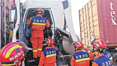 本报12月28日讯 12月26日上午11时30分许,青岛开发区消防救援大队接到求救电话,疏港高架路黄河路入口附近发生车辆追尾事故,一人被困在驾驶室内,情况十分紧急。