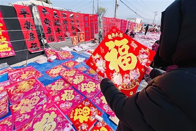 龙年将至,摊位上不少福字带有“龙年大吉”“祥龙送福”等龙年祝福语,人们在福字摊前,在各种带有龙年元素的福字堆里挑一挑,图案、寓意、样式,样样都要讲究,不一会儿就挑花了眼。精挑细选后,大家心满意足地将“美好心愿”带回家,过年的仪式感瞬间拉满。家住附近的胡女士买了十多个大大小小的福字。一周前的夏庄大集,胡女士就想来购买福字和春联,可是那时还没有商贩来卖,“果然进了腊月门,才有年味,卖福字的摊位格外多。”记者了解到,福字根据大小以及工艺不同,价格也不同。小福字单价5元左右,大福字单价15元左右。
