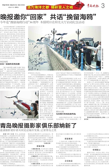 “北来的海鸥请留下,岛城就是你的家”。30年前,创刊两年的青岛晚报与青岛鸟类环志站联合发起“挽留海鸥行动”。30年间,经过了固定人员定时投食到市民、游客自发投食,再到目前形成海鸥食物供应市场,栈桥和青岛湾附近越冬的海鸥由当年的仅300只,到今天超过10万只。前海戏鸥成为青岛的一大特色景观,成为青岛冬季旅游宝贵的资源,更成为保护绿水青山、守护生态环境的一张亮丽名片。本周六,纪念青岛晚报“挽留海鸥行动”30周年系列活动启动仪式暨掌上青岛APP7.0升级上线仪式将在市南区太平路33号原青岛日报社阳光大厅举行,诚邀晚报读者、掌上青岛的粉丝们到场,共同回顾挽留海鸥的那些温暖瞬间,共同开启保护大自然、守护美好家园的新征程。
