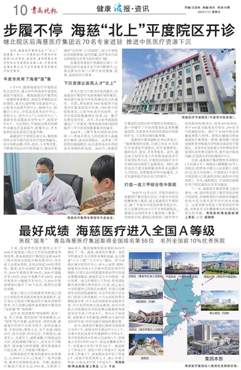 2022年,三级甲等中西医结合医院——青岛市第五人民医院并入海慈医疗集团,成为其西院区。这两家三甲医院的强强联合,标志着青岛在中西医结合领域的新高度。2023年,海慈医疗集团的北院区和平度院区相继成立,进一步提升了中医药服务的品质和覆盖范围,实现青岛中医药优质医疗资源的扩充、下沉和区域均衡发展。