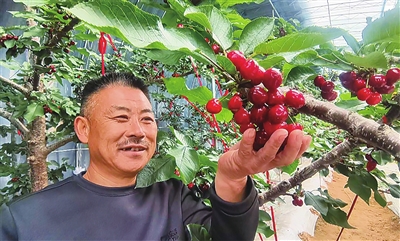 “为了打好时间差,实现大樱桃的提前上市,我们采用了先进的制冷降温技术。”金东乔说,在去年9月份的时候,当大多数樱桃树还在生长阶段,他们便开始对大棚进行预冷处理。通过人为调节大棚内的温度,使樱桃树提前进入休眠期。进入去年11月后,他们再次调整温度,促使樱桃树提前苏醒并开始开花授粉。这样,到了今年1月份,当大棚外面还是一片严寒,大棚里的大樱桃已经悄然成熟,成为冬天里的稀罕之物。“今年大樱桃产量约在2000斤一亩,12克以上的果子能够卖到380元一斤,收入十分可观。”金东乔说。