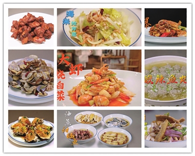 1.辣炒红岛蛤蜊 2.家常烧(蒸)鱼 3.葱烧海参 4.大虾烧白菜 5.油蒸甜晒鱼 6.猪手烧鲍鱼 7.蒜蓉蒸牡蛎 8.胶东琅琊鸡 9.酸辣鱼丸 10.酱爆八爪鱼 11.海蜇里子烩茭瓜 12.韭菜炒海肠 13.胶东大锅菜 14.鲍鱼土豆丝 15.原味蒸海鲜 16.烤海鲜 17.炸虾仁 18.琴岛炸肉 19.酱猪蹄 20.末货酱 21.拌海螺 22.海米炝芹菜 23.青岛海凉粉 24.拌海蜇皮 25.脂渣拌圆葱 26.海鲜疙瘩汤 27.鸡汤馄饨 28.海鲜全家福水饺 29.海鲜烫面蒸包 30.三鲜锅贴。