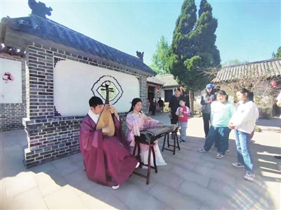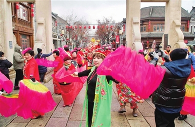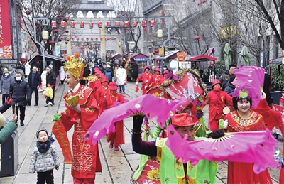 在古城的西门里大街,一支秧歌、腰鼓队伍正缓缓向前走着,演员们头戴面具,扮演成财神、孙悟空、猪八戒等传统神话人物,挥舞的彩扇,铿锵有力的鼓点,将节日的气氛渲染得热情浓烈。文庙门口的投壶、套圈活动吸引了许多小朋友参与。“我们想通过投壶这样的传统竞技比赛,让游客更身临其境感受传统文化的魅力。”即墨古城文旅展演部业务经理单洪超告诉记者。