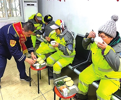 “喝上一碗腊八粥,就预示着新的一年开始了。”准备上车的陈女士接过粥连声赞叹道。忙碌了一早上的环卫工人换班后也齐聚候车室,大家边喝粥边聊天,现场欢声笑语其乐融融,每个人脸上都洋溢着喜悦与幸福。“早上出门的时候没来得及吃早饭,肚子里空空的,喝了一份热气腾腾的腊八粥后感觉舒服多了,浑身都暖和了。”负责香港中路周边卫生的环卫工人王师傅笑着说。