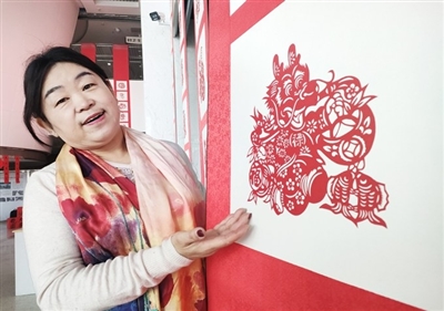这次创作龙元素的剪纸系列,是由胶州非遗手工坊的董丽霞、黄利、王爱军、赵斌、刘殿杰、张淑芳共六位女剪纸艺人,共同创作的胶州剪纸——《百岁贺龙》。在活动现场,董丽霞以一幅《龙年送福》为例与记者分享:“这幅作品我用了半个多小时剪出来的,以传统手法,右手拿剪刀,左手转纸,手随心运,剪出万千世界、万般风情。”