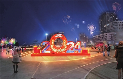 “欢欢喜喜迎新年”主题气膜灯饰设置在世纪广场,寓意“2024年是充满生机活力的一年”,大型的“春”字布置在广场中轴线上,四周“福”字环绕,最外层的两排中国结将喜迎新春的仪式感拉满。在网红打卡地——城市客厅设置“新年新气象”主题钢结构灯饰,充分利用数字“2024”的形状结构形成拍照造型框,灯光以暖色为主基调,变换的色彩时尚炫丽,适合打卡定格新年的温馨瞬间。