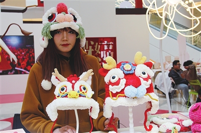 “喜庆的龙头帽戴在头上招财运。”一位摊主向前来逛新年市集的市民介绍。“这龙帽子的鼻子上,还有鼻孔呢。”逛市集的小朋友惊喜地说。“今年龙年,结合普通的长针帽,做了几款造型,尤其是龙头帽、老虎帽和醒狮帽卖得比较好,我先做设计稿,然后针织,分步缝合。你看龙角和龙须是它的特点,这龙须是毛线勾起来,再把固定的铁丝装进去,做造型,最后缝合就像龙须了。”摊主于小姐告诉记者。
