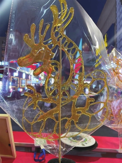 青岛市非遗传承人44岁的糖画艺人周丕春说:“糖画龙,笔画多,用糖量足,对功底要求很高。”在李沧区万达广场的非遗手造市集上,带娃的宝妈挑选了一条糖画龙。“这条龙,我用三笔就画出来了,第一笔画龙头和龙身,一口气画,不能喘粗气,因为喘气手容易抖。第二笔画龙爪,基本功拉丝要均匀,该粗的地方粗,例如龙身要粗些,龙爪要从粗到细,来表现龙爪的锋利。最后画祥云,这三步都有一个连接点,才能串起整条龙。”周丕春以生肖龙为例,向记者简单介绍了糖画的制作工艺。根据糖画的复杂程度和大小,一件一般15元至30元,前来选购的市民络绎不绝。