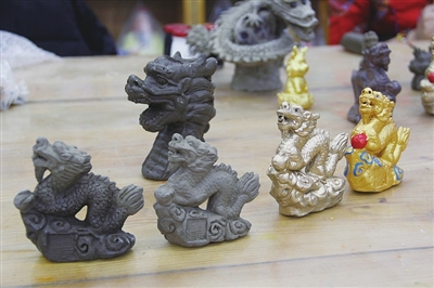 2月5日下午,走进刘氏泥塑的工作室,偌大的长条桌上陈列着她制作的金龙泥塑作品,小的泥塑龙有10厘米高,个大的20厘米高,还有更大的龙和卡通的小龙。