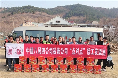 本报2月17日讯 为全力保障施工进度,冲刺“开门红”,中建八局四公司装饰公司青岛虚拟现实创享中心项目部出实招、办实事,开通返岗直通车,从家门到厂门,点对点接送农民工返岗复工。