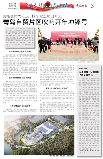 2月19日上午,青岛自贸片区2024年重点项目集中开工仪式在海尔施特劳斯净水科技产业园项目工地举行,总投资约73亿元的16个重点项目集中开工,正式吹响了2024年高质量发展冲锋号,打响项目建设攻坚战。此次集中开工的重点项目涵盖集成电路、智能制造、基因与细胞诊疗、数字经济等7个行业领域,规模体量大、预期效益好、带动能力强,将进一步增强青岛自贸片区发展活力、积蓄发展后劲,为全年经济稳定回升和持续健康发展注入强劲动力。