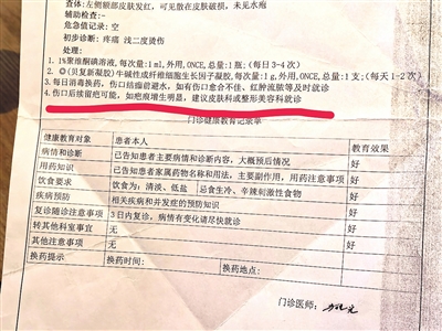 记者在门诊病历上看见了“伤口后续留疤可能”字样。病历上还写明,如果疤痕增生明显,建议到皮肤科或者整形美容科就诊。