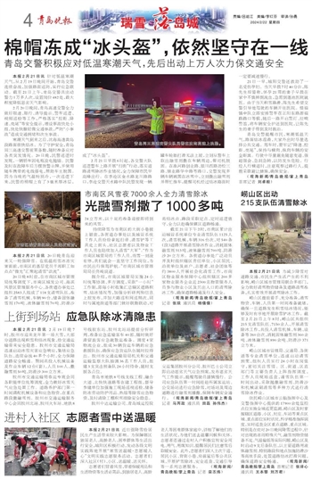 志愿者们冒着风雪,带着保暖用品和生活物资等生活必需品,到独居老人、高龄老人等困难群体家庭中,详细了解他们的生活状况,为他们送去温馨问候和关怀。志愿者还通过走村入户积极宣传安全用电、用气、用煤知识,提醒居民们注意雪后取暖安全。此外,志愿者们深入主次干道、居民小区、背街小巷、房前屋后等公共区域,开展铲雪除冰、安全巡查、交通引导等一系列志愿服务。 (观海新闻/青岛晚报/掌上青岛 记者 栾丕炜)