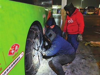“今天晚上有冻雨天气,路面会结冰打滑,我们提前安装了防滑链。”20日晚,在小麦岛公交停车场,维修人员对车辆加装防滑链,全力保障雨雪天气行车安全。“遇到冰冻路面影响行车安全时,公交车就会挂装链条上路,就像是穿上了‘铁鞋’,使其能够平稳运行。”公交崂山二分公司副经理孙磊介绍。
