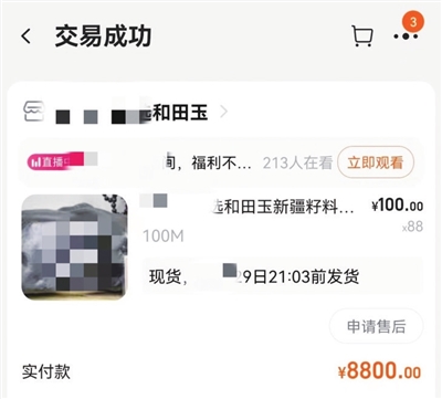 李先生是和田玉爱好者,早在2018年通过某平台直播接触到和田玉,并不断了解玉石知识,自学成为一名玉友。“和田玉以‘白’为贵,我一直关注白玉,其他色系关注不多。上个月,偶尔刷到一家墨玉直播间,在线人数少,产品价格高,随便一件都要大几千,连续关注了几天,觉得挺靠谱,就以8800元的价格买了一条‘塔青’手串。”李先生告诉记者,手串商家开价2万元,他砍价砍到8800元,收到货后再“砍一刀”,最终以7000元成交。“现在看来,这就是套路,开高价,等着玉友砍,玉友敢出价,商家就敢上车。其实,就是‘给钱就卖’。”李先生表示。