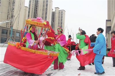 扭秧歌、敲锣打鼓、跑旱船、茂腔……20日一大早,城乡秧歌队伍带着具有地方特色的民俗艺术表演,齐聚李哥庄镇龙屯社区,屋外白的雪地、屋内红的彩绸交相辉映,寒冷的天气,白皑皑的大雪丝毫没有影响文化进万家的热情。演出队员们用舞姿为周边村民带来精彩纷呈、独具胶州风味的文化大餐。