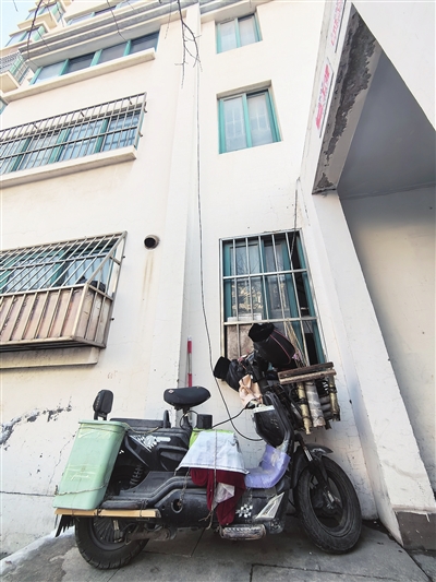 通过自家的门窗,私拉电线或接插排为电动自行车充电,俗称“飞线充电”。这种充电方式因为非常危险,被明令禁止:遇到下雨下雪天,户外的插座容易短路;那些从家中拉出来的电线,粗细不均,有的老旧破损,有的负荷不达标,存在不同程度的安全隐患,极易引发火灾。在兴隆家园小区5号楼前,一辆“飞线充电”的电动自行车停在单元楼门口,推开单元楼大门,楼梯口还停着一辆电动自行车。
