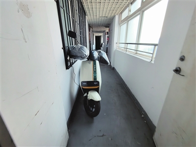 消防安全连廊是很多高层住宅的必备设施,一旦失火,高层住宅居民可通过连廊迅速转移到隔壁单元。但记者在5号楼内探访时却发现,11层的消防安全连廊内停着一辆电动自行车——一旁还贴着提示牌:消防通道严禁攀爬、堵塞。