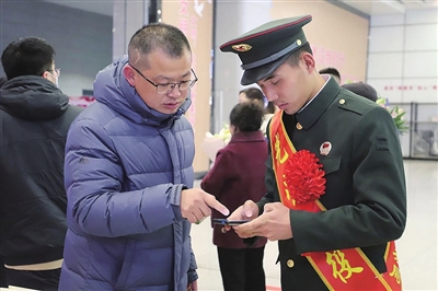 暖心服务,“兵”至如归。在青岛西站出站口,市退役军人事务局的工作人员热情地为退役军人佩戴“荣归”红花,送上包含报到须知、就业创业政策、信息采集、优待证申领办理指南等内容的《荣归返乡攻略》,为退役士兵进行报到预登记,提供引导帮办、咨询解答等服务。