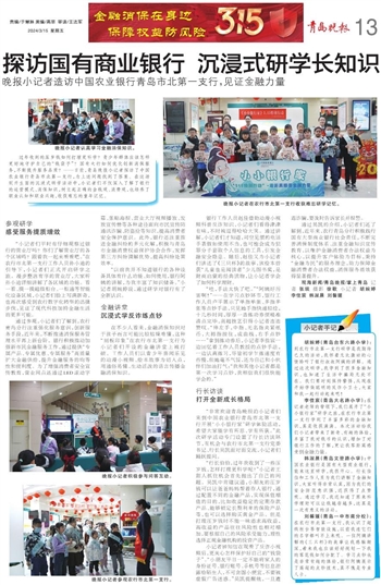 过年收到的压岁钱如何打理更科学?青少年群体应该怎样更好地守护自己的“钱袋子”?国有大行如何优化创新消保服务,不断提升服务品质?……日前,青岛晚报小记者探访了中国农业银行青岛市北第一支行,为上述问题找到了答案。在这场别开生面的沉浸式研学活动中,小记者们不仅深入了解了银行的运营模式、消保知识,树立起正确的金钱观、消费观,也培养了职业认知和职业兴趣,收获难忘的童年记忆。
