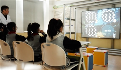 每个班级配备全光谱护眼灯,使照明更真实自然;一年级学生课桌边安装了国内最先进的坐姿矫正仪器,可以有效解决坐姿疲劳,同时限制了左右侧趴、身体前倾等不良姿势;走在校园里,一抬头就能看到“上墙”的E字远眺图……在松岭路小学,爱眼护眼的氛围感拉满。学校的沉浸式近视防控科普实验室科技感十足。在这里,孩子们可以体验不同近视度数所看到的视物模糊程度,感受近视给生活、学习带来的不便;戴上视力损伤体验镜,通过青光眼、屈光参差等不同类型的视力损伤体验,感受不同的场景;还可以进行3D视觉训练,以声、光、电的形式,锻炼人眼晶状体,增加眼部血液循环,提高双眼融合等各项视觉功能,达到触动、感动、行动的教育目标。此外,实验室有一套视觉健康筛查设备,可以定期监测眼轴的增长变化情况,准确判断近视趋势,及时提出预警。